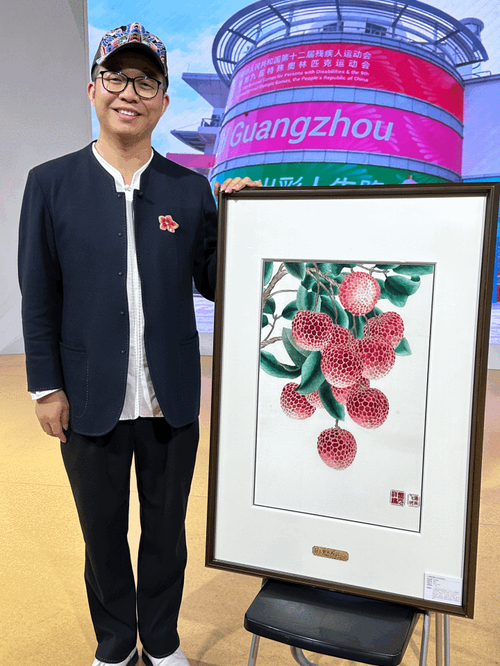 据介绍,潘燕飞是一名退役运动员,在此前曾是残障人篮球队的成员,因为渴望再就业的机会,在看到学校的招生广告后便第一时间联系。经过数月全心全意地学习,潘燕飞也顺利成为工作室的一名员工,她的作品《荔红盈福》还在广州市第十四届残疾人书画展中获得二等奖。