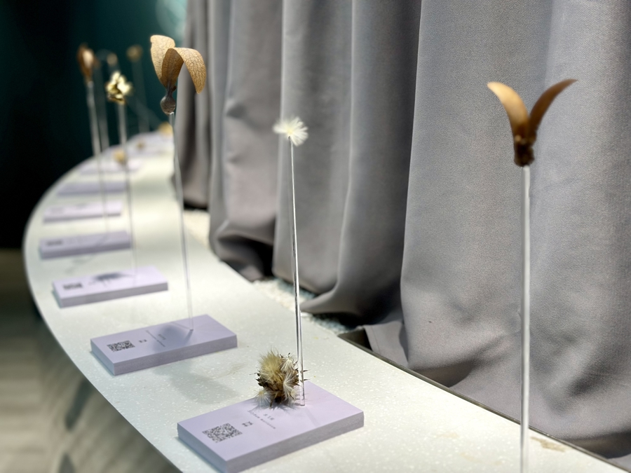 在这里,你还能看到其它风传种子的“旅行图鉴”——翅葫芦可以滑翔数百米,槭属种子可以旋转飞行,长喙婆罗门参、水飞蓟等顶着精致的“降落伞”随风轻舞,沙拐枣、角果黎则在开阔地带依靠风力滚动迁移。难得一见的缅甸胶漆树、国家一级重点保护野生植物望天树、中国特有种鹅掌楸等濒危及罕见物种的种子,也首次亮相。