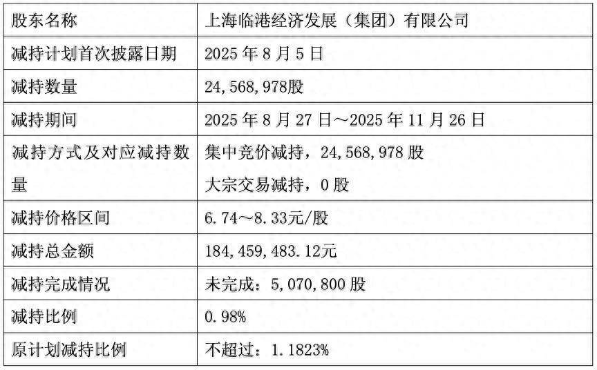 本次减持股份计划实施前,临港集团持有公司无限售条件流通股154,991,178股,占公司总股本的6.18%。当前持股数量130,422,200股,占公司总股本的比例为5.20%,为公司第三大股东。